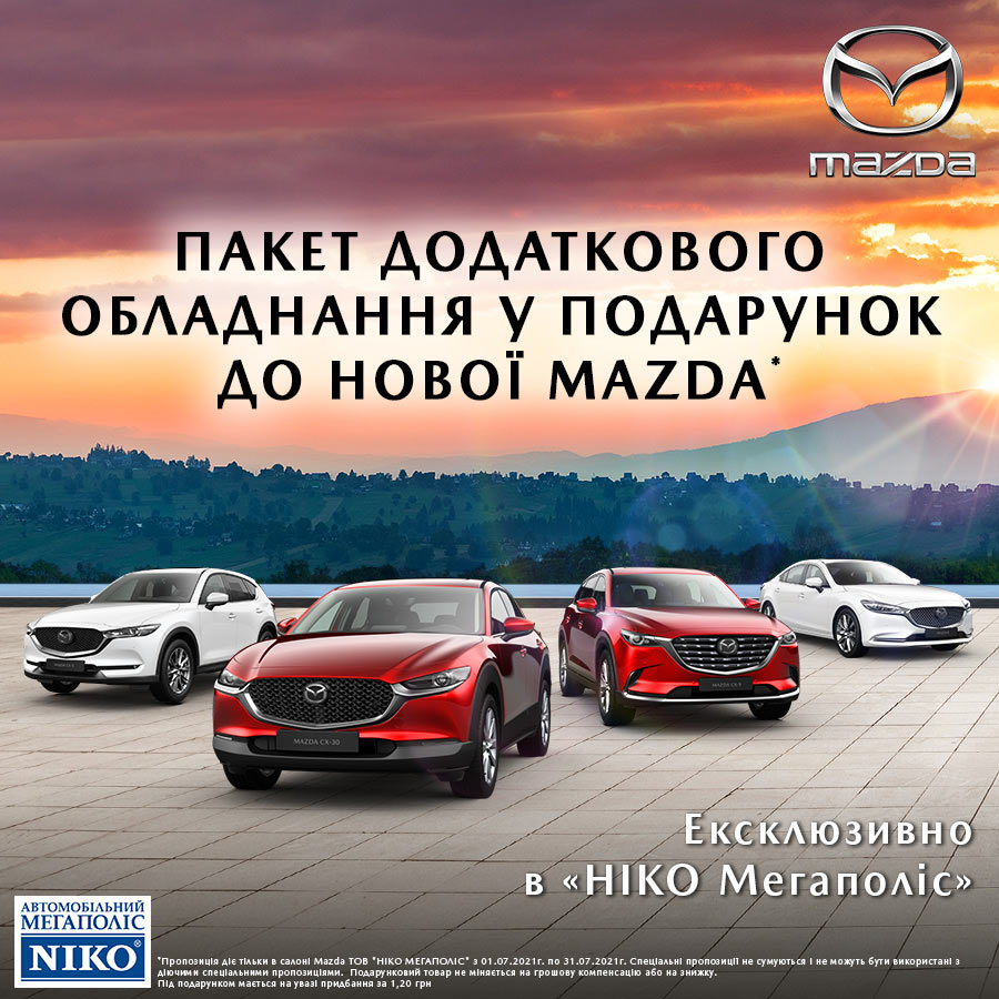 Ексклюзивно! Тільки з 01 по 31 липня 2021р, купуйте улюблений автомобіль Mazda в дилерському центрі «НІКО Мегаполіс» та гарантовано отримайте у подарунок пакет аксесуарів.