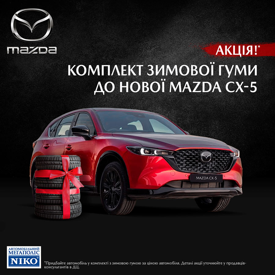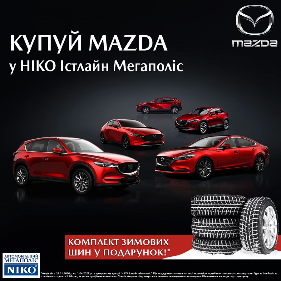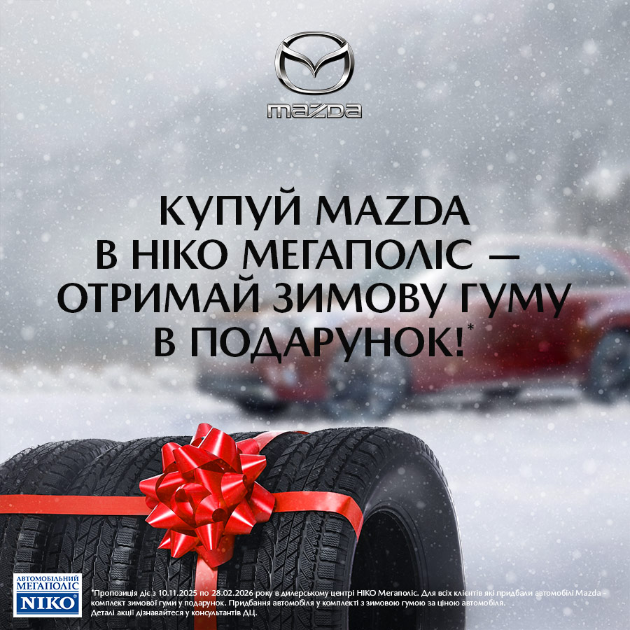 З 10 листопада 2025 року до 28 лютого 2026 року кожен покупець нового автомобіля Mazda у Ніко Мегаполіс отримає комплект зимової гуми у подарунок*!