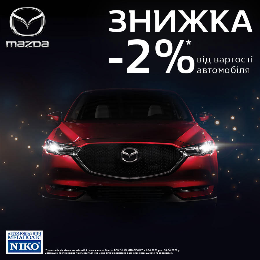 Тільки в період з 01.04.2021г. по 30.04.2021 р кожен хто звернеться за консультацією гарантовато отримає сертифікат на свою персональну вигоду -2% знижки на купівлю нового авто Mazda в дилерському центрі «НІКО Мегаполіс».